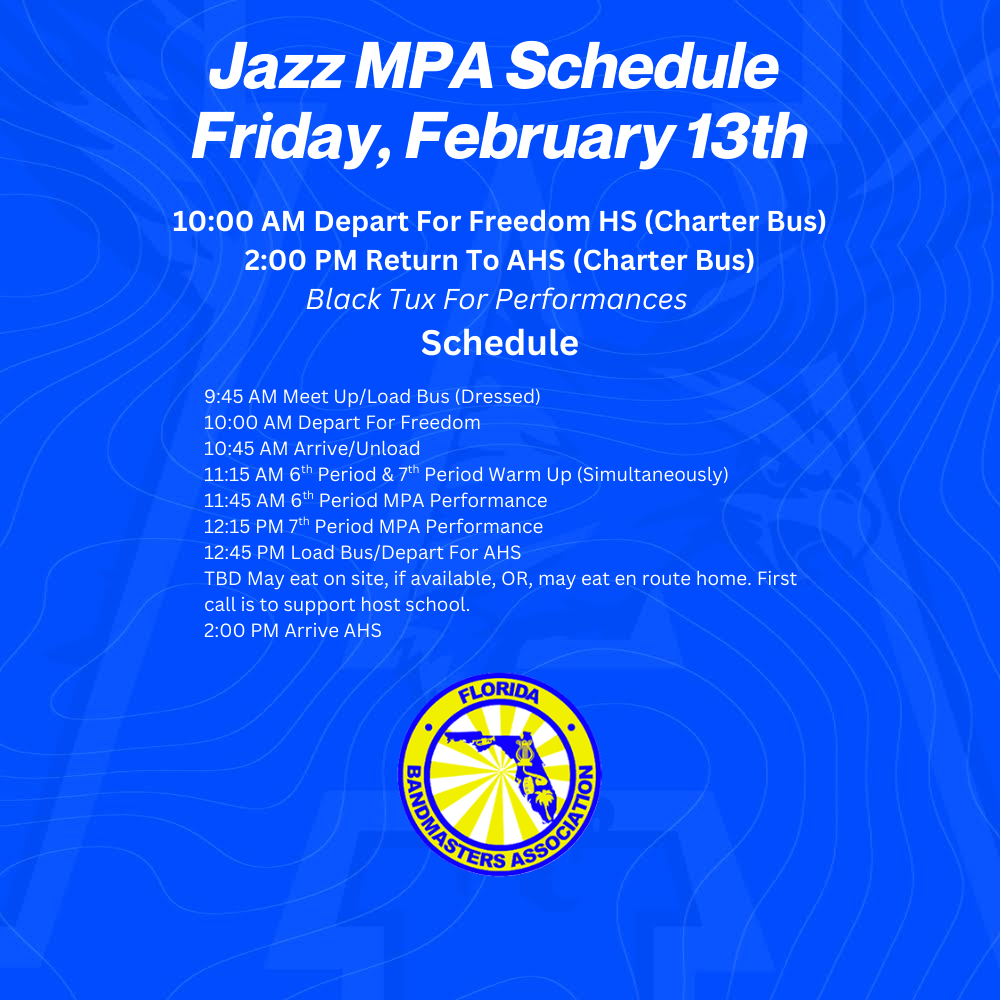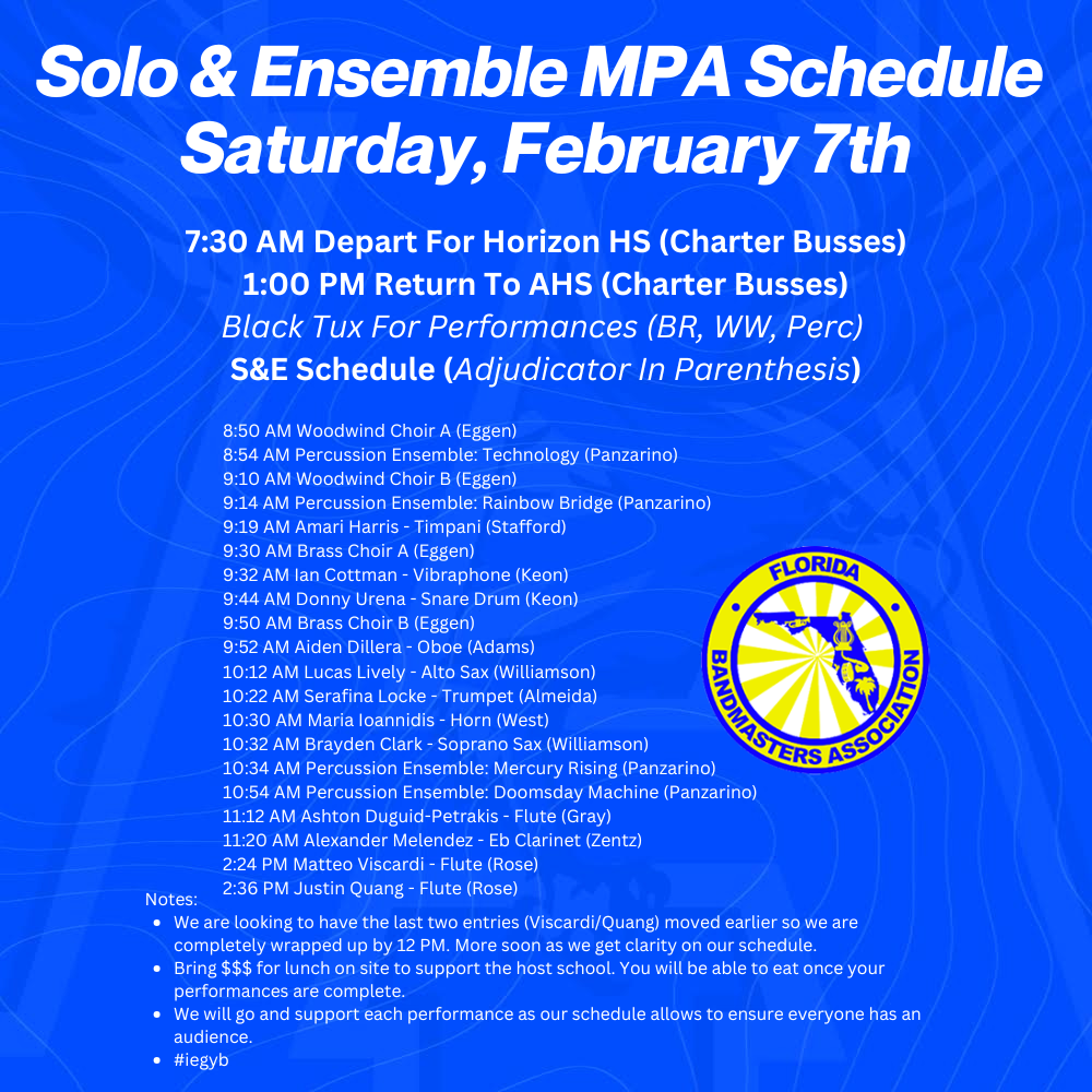 - Symphonic Band & Percussion 2.2*, 2.10, 2.17, 2:24 (Tuesday’s: 2:30 PM – 3:15 PM) *=Monday
